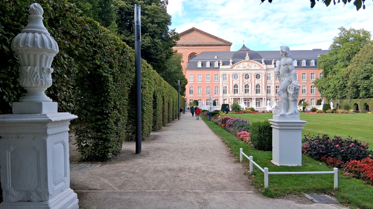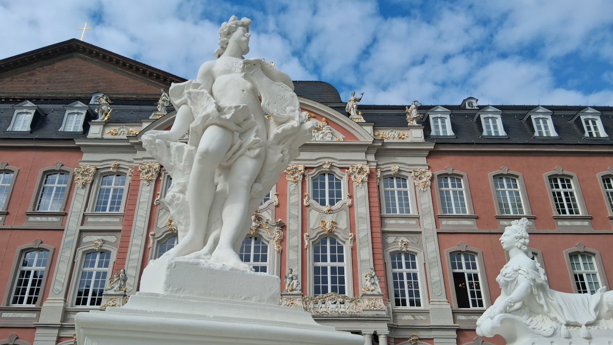 Blickfang Nummer 1 ist der Südflügel des Kurfürstlichen Palais. Opulent, verspielt und vielleicht sogar ein bisschen überkandidelt – so präsentiert sich die barocke Fassade. Geschaffenen von Balthasar Neumann-Schüler Johannes Seiz, Hofbaumeister aus Trier, und Bildhauer Ferdinand Tietz (1707 – 1777). Den Auftrag dazu gab Kurfürst Johann Philipp von Walderdorff (1756 – 1768); er lautete vermutlich: „Setzt das Blühen des Trierer Landes unter meiner Regierung in Szene!”