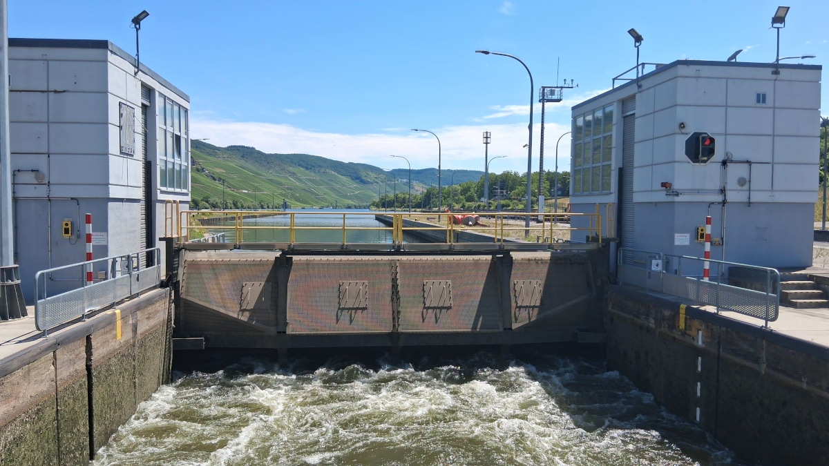 Ein gewichtiger Grund dafür ist das Gefälle der Mosel. Um den Wasserstand regulieren zu können, wurden deshalb ab 1958 die Stauanlagen gebaut, eine Fahrrinne ausgebaggert und der Fluss damit auf einer Länge von 394 Kilometer für Schiffe bis zu 1500 Tonnen schiffbar gemacht. Deshalb müssen Frachter und Ausflugsdampfer heute zwischen Neuves-Maisons in Frankreich und Koblenz 161 Höhenmeter überwinden – mithilfe der Schleusen, in denen sie auf Berg- oder Talfahrt gehen.